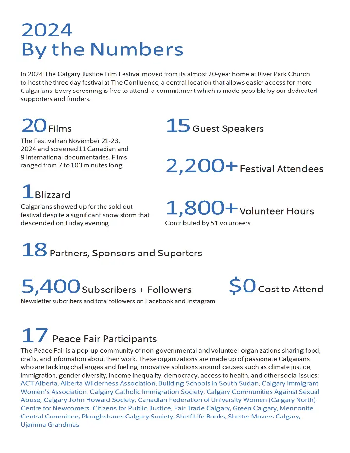 Curating four JustREEL community events in 2026 will extend the work of the Calgary Justice Film Festival (CJFF) and its Peace Market into year-round community engagement. Each November, CJFF hosts the Peace Market alongside its free documentary screenings, where over 30 non-profits share their work related to justice, human rights, and social equity. This project will deepen that impact by co-developing events that bring curated film screenings, panel discussions, workshops, and resource-sharing into neighbourhoods across Calgary.