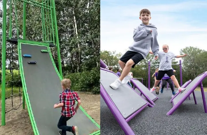 The challenge of the Agility Wall and Breakaways will specifically appeal to older children, children with ADHD, and those with proprioception-seeking sensory behaviours, without being exclusionary to younger children or those with limitations who can continually work to get higher on the wall. With the high contrast colours subset into the rubber surfacing, as well as the brightly coloured framing, children with visual impairments will be able to safely push their limits of play.