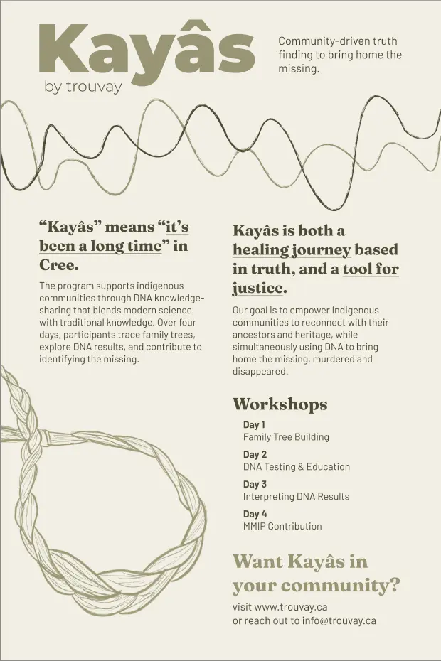 The Kayas: Community DNA program is a community-driven initiative led by the Frog Lake First Nation Public Library in partnership with Trouvay, an organization dedicated to truth and justice, utilizing investigative genetic genealogy in collaboration with Indigenous knowledge. This project offers a unique opportunity for Frog Lake First Nations #121 & #122 members to explore identity, family lineage, and ancestral connections through the lens of DNA and oral history. "Kayas," meaning "long ago" in Cree, reflects the project’s mission to reconnect our people with their past through modern tools and traditional knowledge.