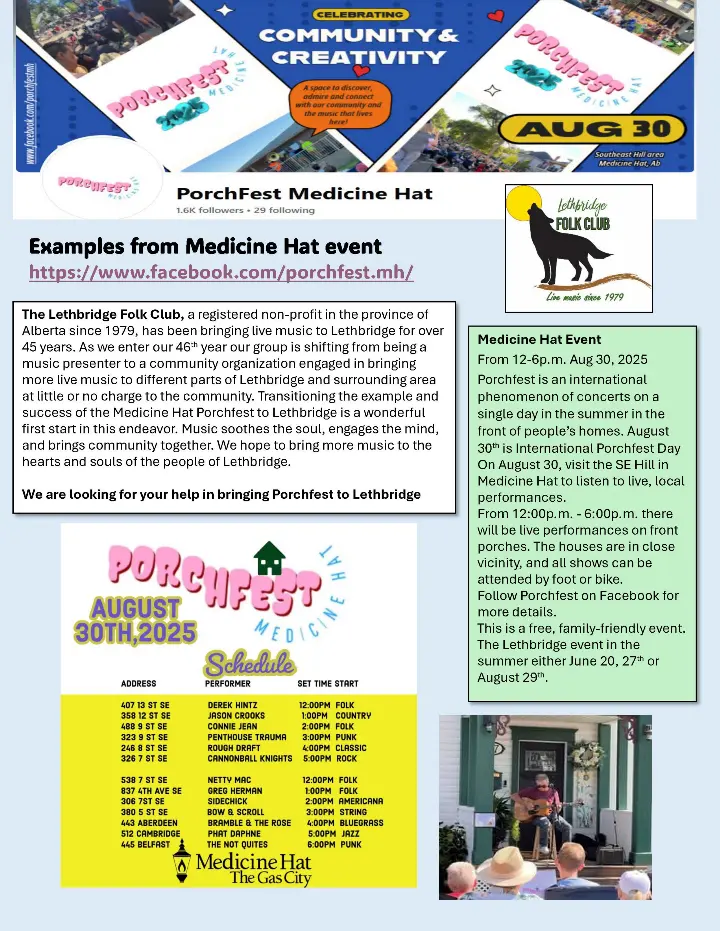 The Lethbridge Folk Club, a registered non-profit in the province of Alberta since 1979, has been bringing live music to Lethbridge for over 45 years. As we enter our 46th year, our group is transitioning from being a music presenter to a community organization dedicated to bringing more live music to various parts of Lethbridge and the surrounding area at little to no cost to the community. Transitioning the example and success of the Medicine Hat Porchfest to Lethbridge is a wonderful first start in this endeavour. Music soothes the soul, engages the mind, and brings people together in community.