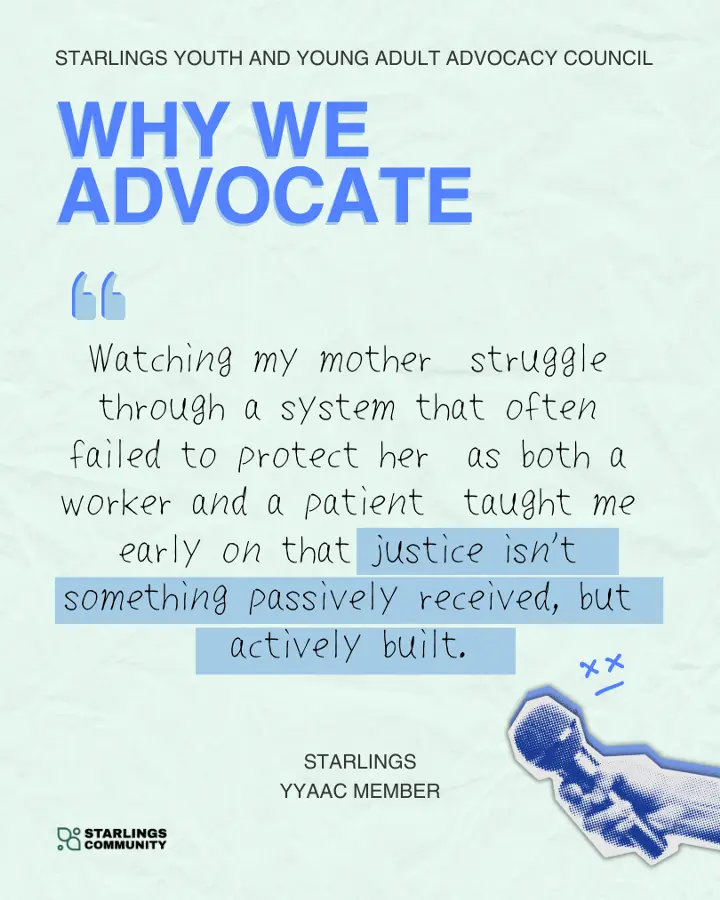 Starlings Community empowers the 1 in 4 youth growing up with the stress and stigma of a parent’s substance use to become advocates for themselves and their peers, which contributes to their healing and the reduction of systemic stigma. Through our Youth Advocacy Council Program, led by our youth lead who has lived experience with the loss of a parent to substance use , young people with lived experience learn about their rights, practice leadership skills, and discover that their voices and stories matter. Many of these youth have been silenced by shame and stigma, told directly or indirectly that their experiences don’t count, and have lacked access to resources, supports, and community to allow them to feel seen, supported, and less shame. Our program shifts this narrative by building knowledge, confidence, and opportunities for collective action and healing.