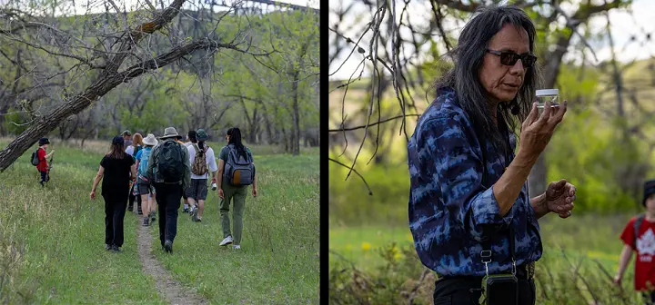 In 2023, funding from the Field Law Community Fund Program supported two Indigenous-led nature walks with Api’soomaahka (Running Coyote) – one at Helen Schuler Nature Centre in Sik-Ooh-Kotoki (Lethbridge) and one to celebrate the summer solstice in Nose Hill Park in Mohkinstsis (Calgary). On May 13 in Sik-Ooh-Kotoki, 15 participants explored about 2 kms of flat, accessible paved and gravel pathways meandering among the open flood plain and mature cottonwood trees of the Oldman River Valley. On June 21 in Mohkinstsis, 30 participants hiked up to a grassland “classroom”, surrounded by views of the open prairie in all directions. CPAWS Indigenous Event Consultant and Guide Sierra Shade successfully brought Indigenous voices to life while following Indigenous protocol, protecting the Indigenous knowledge being shared, and facilitating a secure environment that fostered experiential learning. The walk leader, Api’soomaahka, is a member of the Kainai Nation of the Blackfoot Confederacy. An artist and illustrator with 40 years of experience, he roots his work in the Niitsítapi worldview and much of his work is imbued with an ethic of environmentalism. He currently operates Naapi’s Garden and Katoyiss Seed Bank and is a member of the Kainai Ecosystem Protection Association and the Oldman Watershed Council.